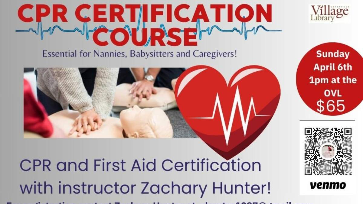 The Osterville Village Library is excited to offer this CPR course in partnership with Zach Hunter from EZ CPR! Are you ready for summer? Get your essential CPR and first aid certification here at the OVL! Sunday April 6th at 1pm in the Main Meeting Room at the Osterville Village Library. This course is $65.